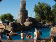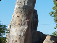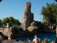 Construction de type monolithique, aménagement et décoration en béton projeté, thématisé pour former un ensemble avec la piscine et rompre avec le traditionnel rectangle bleu. Départ au sommet d'une tiroline de 50 mètres, nouvelle attraction du camping, prisée par la jeunesse.