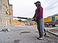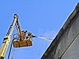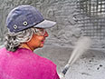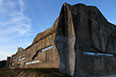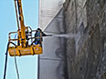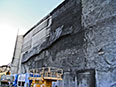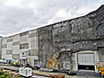 Cette bodega, joli nom espagnol donné aux caves, est un outil de production extrêment moderne et adapté à son temps, mais son apparence était horrible : un grand bâtiment blanc qui détonnait dans le paysage et Monsieur Torres souhaitait que cette cave soit intégrée dans le paysage. Il s'agit de 4200 m2 de murs de façade. A l'aide de techniques bien rodées, des maillages sont fixés sur les façades pour faciliter l'accroche du béton projeté, sculpté, pour "casser" ce bloc et le faire apparaître un peu comme un château ou une falaise dont les couleurs se marient bien avec l'environnement, des jardinières suspendues fleuries, permettent également de rompre la monotonie et d'ajouter des coloris.
